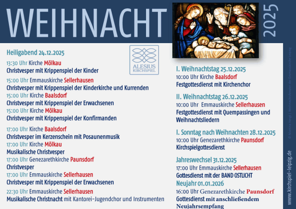Die Kinderkirche in der Kirche Mölkau, mittwochs, 16.00–17.50 Uhr, findet wie gewohnt statt, Gemeindepädagogin Claudia Bemmann übernimmt dankenswerter Weise beide Gruppen.